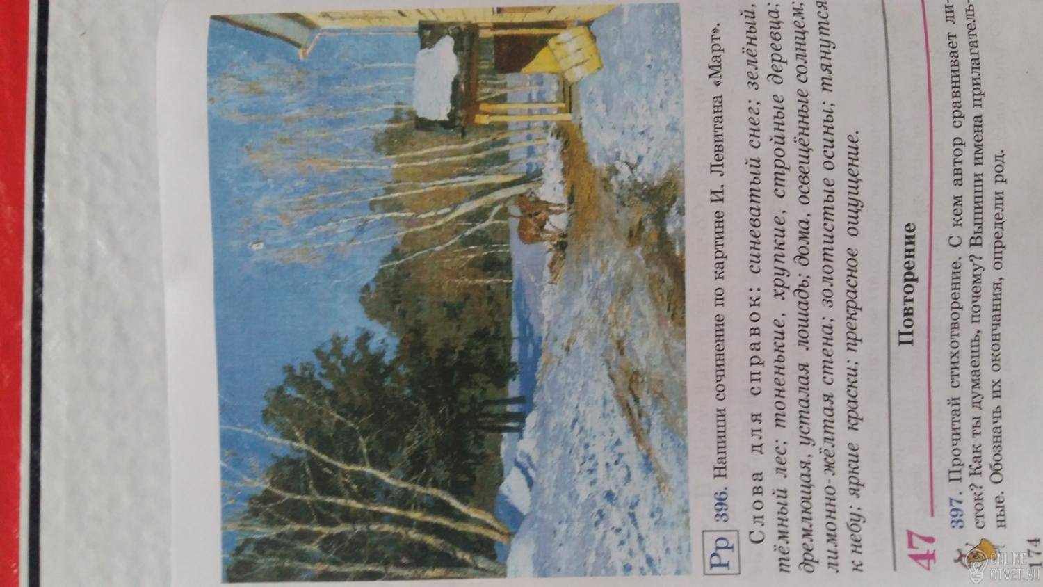 Небо безупречного голубого цвета говорит нам о том, что метелей не предвидится. Неужели пришла весна? Подтаявшая дорога и несброшенная осенняя листва на деревьях ждут перемен. Всё ожидает прихода нового тёплого сезона! Природа нежится в тёплых солнечных лучах. Слева перед нами предстаёт лес, ожидающий весну. Картина здесь разительно отличается. Хвойная зелень отбрасывает тёмные тени. Очевидно, что в лесу царит зимний холод, краски мрачные и тёмные. Солнечные мартовские лучи ещё не успели обогреть хмурые сине-зелёные ели, а так хочется, чтобы солнце ярко-золотым светом озарило их насупившиеся кроны! Скоро это произойдёт, ведь на дворе - март!