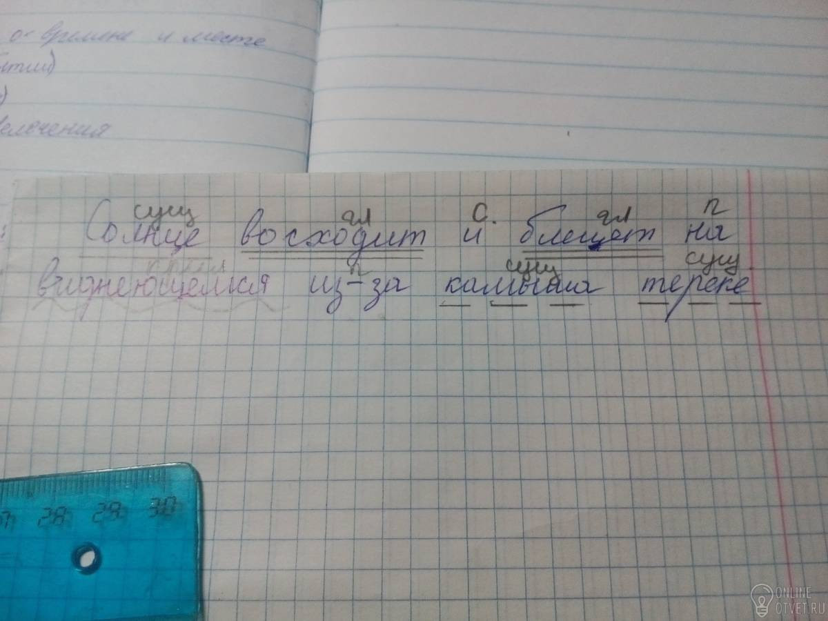 Синтаксический разбор предложения „Солнце восходит и блешет на виднеюшемся из-за камыша тереке”