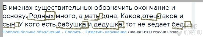 В именах существительных обозначить окончание и основу. Родных много, а мать одна. Каков отец-таков и сын. У кого есть бабушка и дедушка, тот не ведает бед