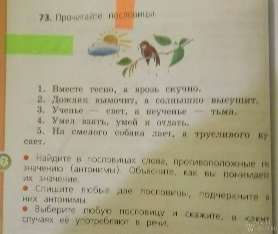 1 точка. Вместе, врозь, вымочит, высушит, свет,тьма, взять , отдать ,лает, кусает.(найти в пословицах антонимы).
