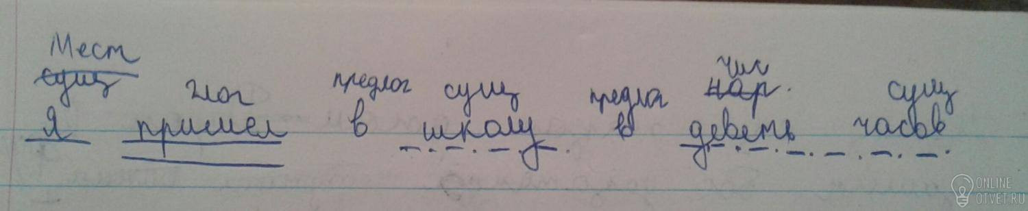 Пришел (Куда?)В школу-В-предлог ,школу -существительное, Обстоятельство-подчеркнуть тире точкой. _ ._._._.