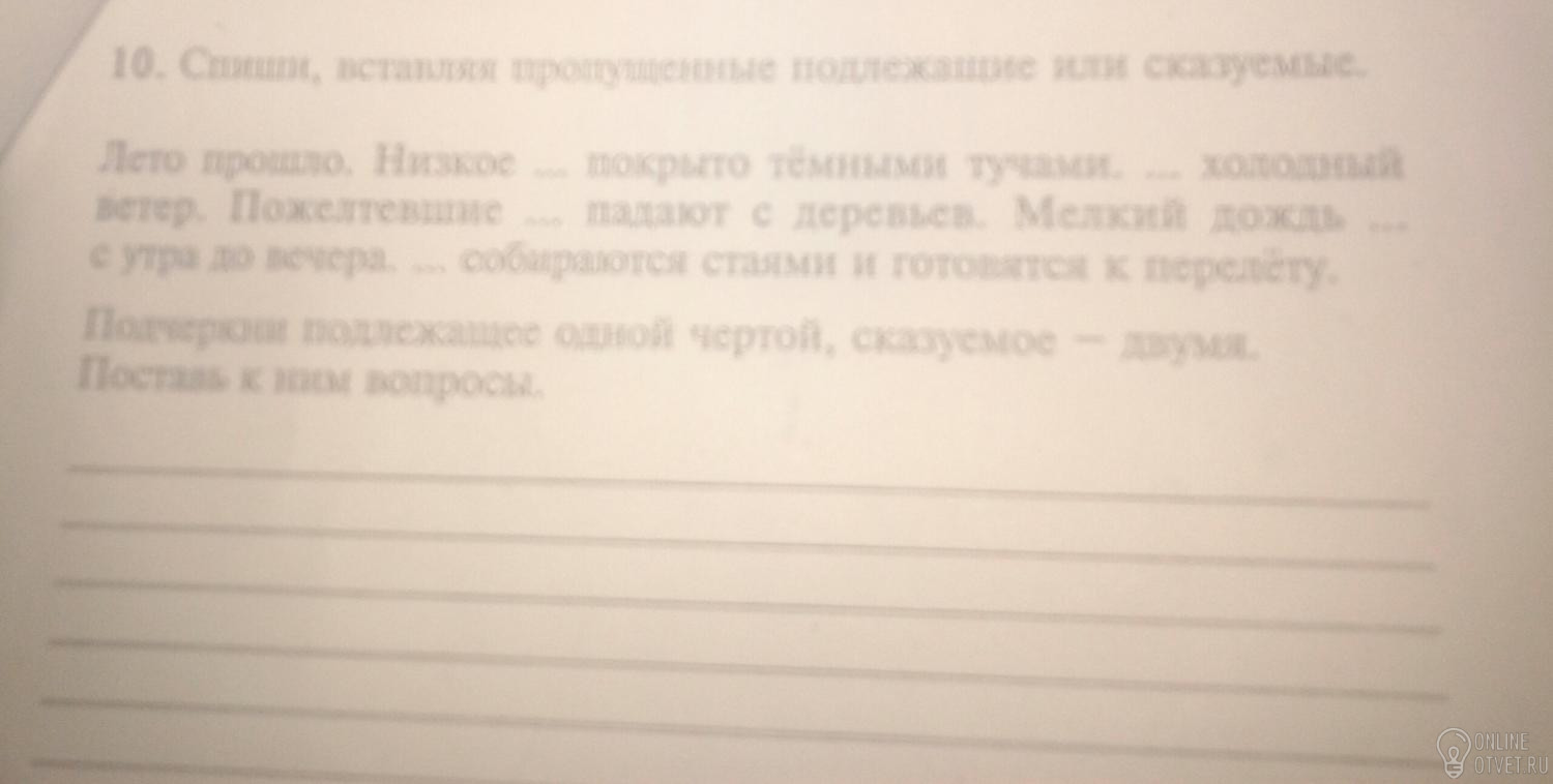 Спиши вставляя пропущенные подлежащие и сказуемые Лето прошло низкое покрыто темными тучами холодный ветер пожелтевшие листья падают с деревьев мелкий дождь с утра до вечера собираются стаями и готовятся к перелету подчеркни подлежащее одной чертой сказуемое двумя поставьте к ним вопросы: даю 15 баллов