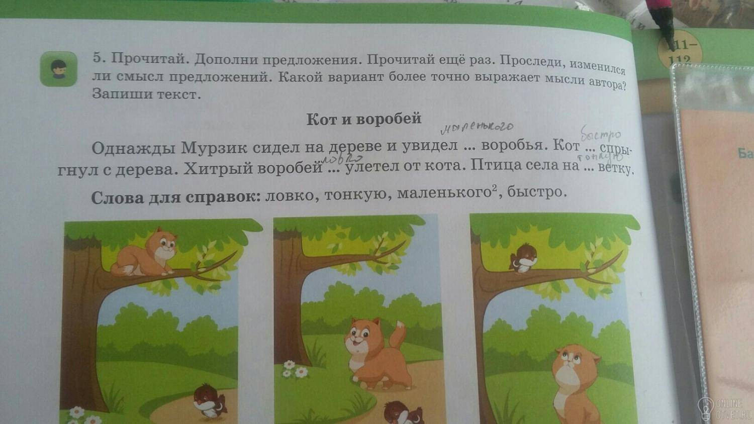 Однажды мурзик сидел на дереве и увидел маленького воробья. Кот быстро спрыгнул с дерева. Хитрый воробей ловко улетел от кота птица села на тонкую ветку