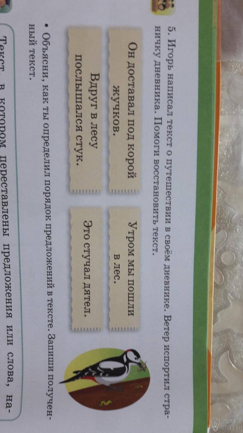 Утром мы пошли в лес. Вдруг в лесу послышался стук. Это стучал дятел. Он доставал под корой жучков.