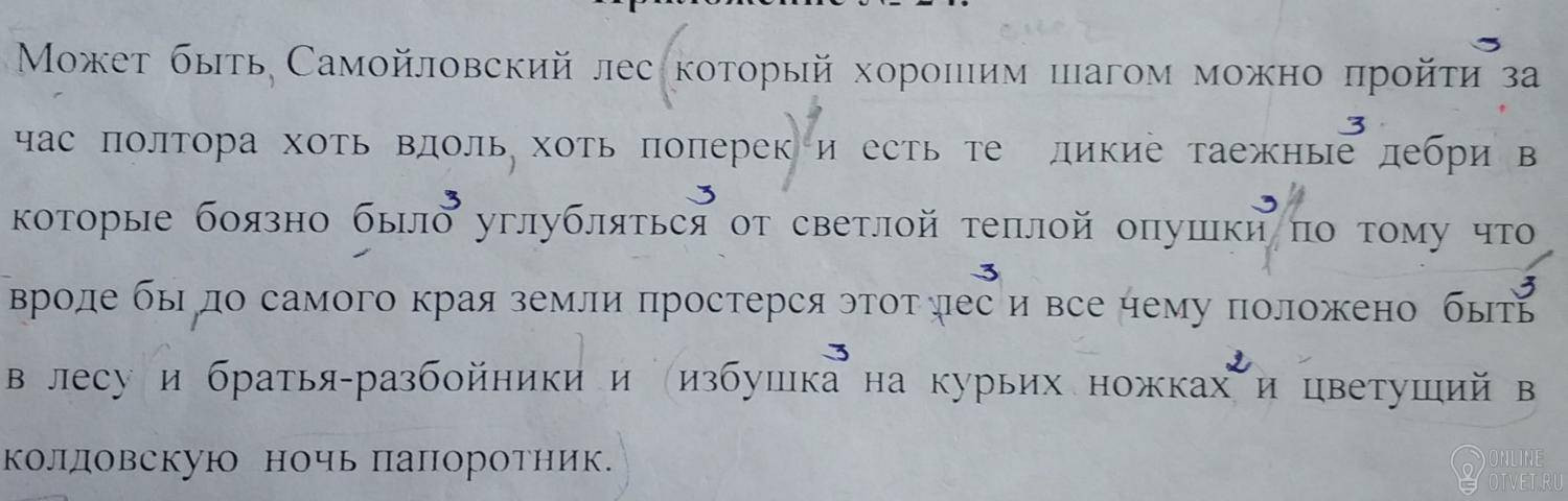 (1)Может быть, Самойловский лес, (2)который хорошим шагом можно пройти за час-полтора хоть вдоль, хоть поперек, (1)и есть те дикие таежные дебри, (3)в которые боязно было углубляться от светлой теплой опушки, (4)потому что вроде бы до самого края земли простерся этот лес и все, (5)чему положено быть в лесу: и братья-разбойники, и избушка на курьих ножках, и цветущий в колдовскую полночь папоротник.