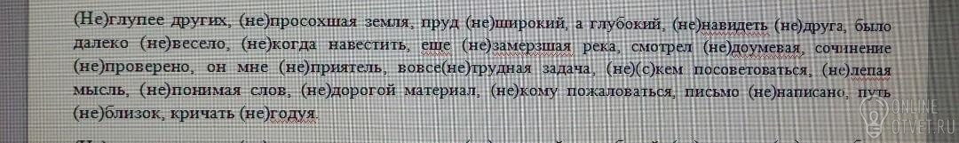 Не глупее других,непросохшая земля,не широкий,а глубокий пруд,ненавидеть недруга,было далеко не весело,некогда навестить,еще не замерзшая вода,смотрел недоумевая,не проверено,неприятель,не трудная задача,не с кем,нелепая,непонимая,недоогой,некому,не написано,не близок,негодуя.
