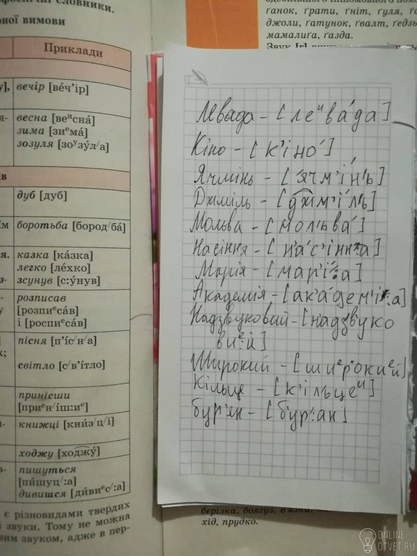 Фонетична транскрипція слів: ливада,кіно, ячмінь,джміль, мольва, насіння, марія, академія, надзвуковий, широкий, кільце, бур'ян.